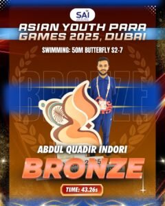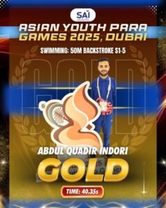 (www.csnn24.com) रतलाम रतलाम के अब्दुल कादिर इंदौरी ने दुबई में आयोजित एशियन यूथ पैरा गेम्स 2025 में तैराकी स्पर्धाओं में शानदार प्रदर्शन किया। उन्होंने 50 मीटर बैकस्ट्रोक (S1-5) में गोल्ड 100 मीटर फ्री स्टाइल में गोल्ड, 50 मीटर फ्री स्टाइल में गोल्ड और 50 मीटर बटरफ्लाई (S2-7) में ब्रॉन्ज सहित कुल तीन गोल्ड और एक ब्रॉन्ज पदक जीते। तथा रतलाम के साथ-साथ पूरे देश का नाम रोशन किया।