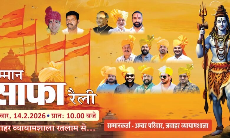 रतलाम। महाशिवरात्रि के पावन पर्व के उपलक्ष्य में प्रतिवर्षानुसार इस वर्ष भी शहर में भक्ति और उत्साह का अनूठा संगम देखने को मिलेगा। जवाहर व्यायामशाला परिवार (अम्बर ग्रुप) द्वारा दौलत जाट पहलवान के नेतृत्व में आज शनिवार को विशाल ‘सम्मान साफा (वाहन) रैली’ का आयोजन किया जा रहा है। इस रैली में हजारों की संख्या में युवा पारंपरिक साफा पहनकर शिरकत करेंगे।