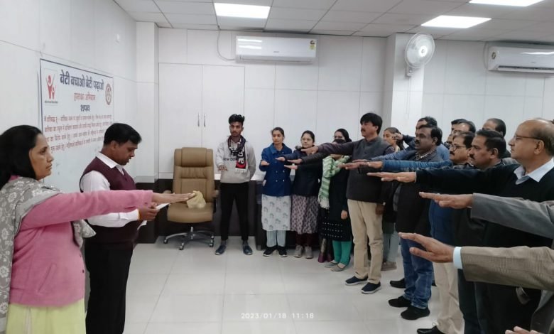 राज्य शासन के महत्वाकांक्षी कार्यक्रम बेटी बचाओ बेटी पढ़ाओ अभियान को लेकर एक महत्वपूर्ण आयोजन कलेक्ट्रेट एनआईसी कक्ष में संपन्न हुआ जहां बेटी बचाओ बेटी पढ़ाओ के लिए कलेक्टर श्री नरेंद्र कुमार सूर्यवंशी द्वारा उपस्थित अधिकारियों कर्मचारियों को शपथ दिलाई गई इसके साथ ही